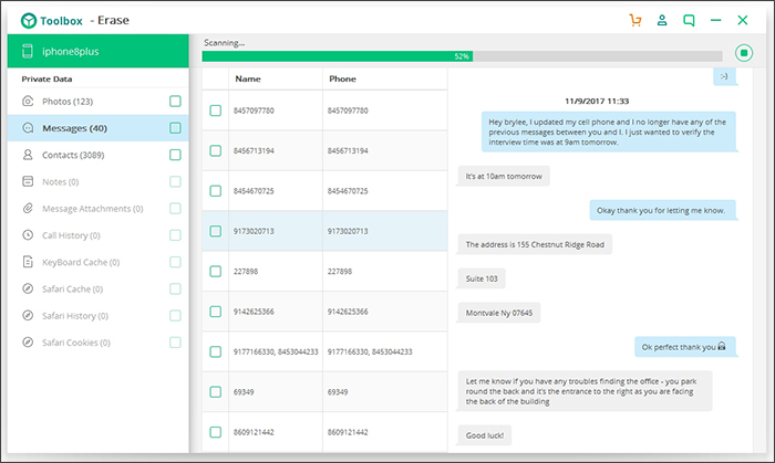 Step 3: Start to Scan Your Device The iSkysoft Data Eraser will start scanning and analyzing your iOS (iOS10) device. Once the scan is through, the iPhone’s data will be shown in the program interface. Step