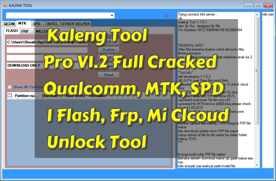 License: Kaleng Tool Pro V1.2 Full Cracked I Qualcomm, MTK, SPD I Flash, Frp, Mi Cloud Unlock Tool. You may try it free for always.